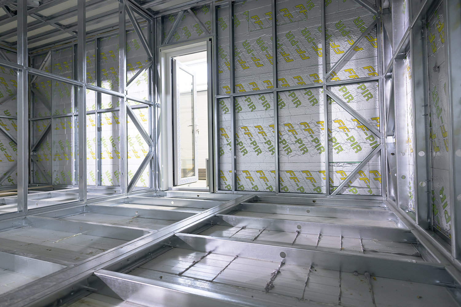 Lengvojo plonasienio plieno konstrukcija, apimanti grindis, sienas ir stogą.